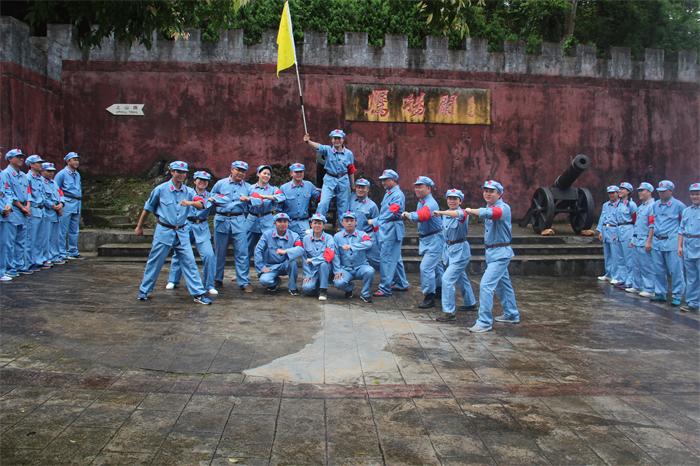 經(jīng)過(guò)一路爬涉,我們終于到達(dá)了紅七軍廣場(chǎng)。廣場(chǎng)足有兩個(gè)球場(chǎng)寬大,廣場(chǎng)的背景是一幅紅七軍的巨型浮雕,“鷹揚(yáng)關(guān)”三個(gè)大字蒼勁有力赫然其中,兩門(mén)古炮架設(shè)兩旁蔚為壯觀。據(jù)教官介紹,這里就是湘、桂、粵三省交界處,號(hào)稱(chēng)“一腳踏三省”的地方。遙想當(dāng)年,紅七軍就是在這里集結(jié)從廣西進(jìn)入廣東連山。