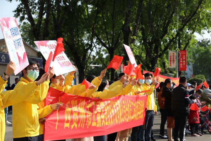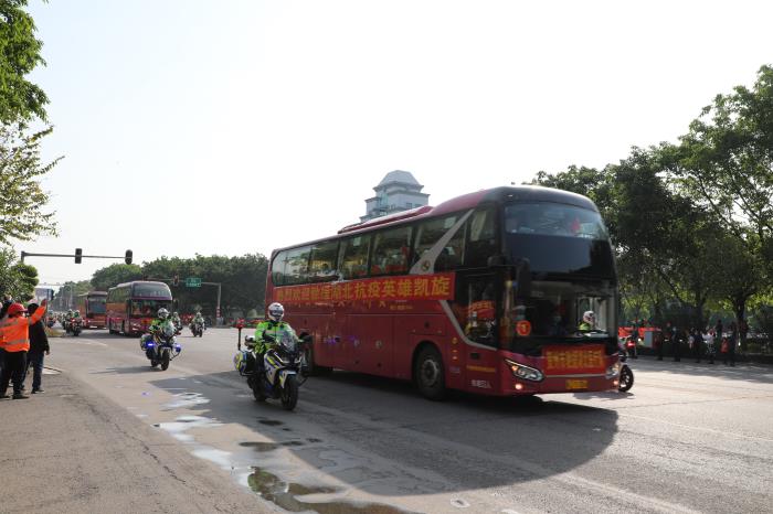 下午16點(diǎn)整,載著賀州支援湖北醫(yī)療隊(duì)的大巴車在33輛摩托車鐵騎、兩輛警車的引導(dǎo)護(hù)航下駛?cè)胭R州大道,警燈閃爍、警笛嘹亮,沿途市民揮舞國旗,夾道歡迎,高聲歡呼,壽城人民用最高禮遇,最深敬意,迎接英雄凱旋,表達(dá)對(duì)英雄的敬意。